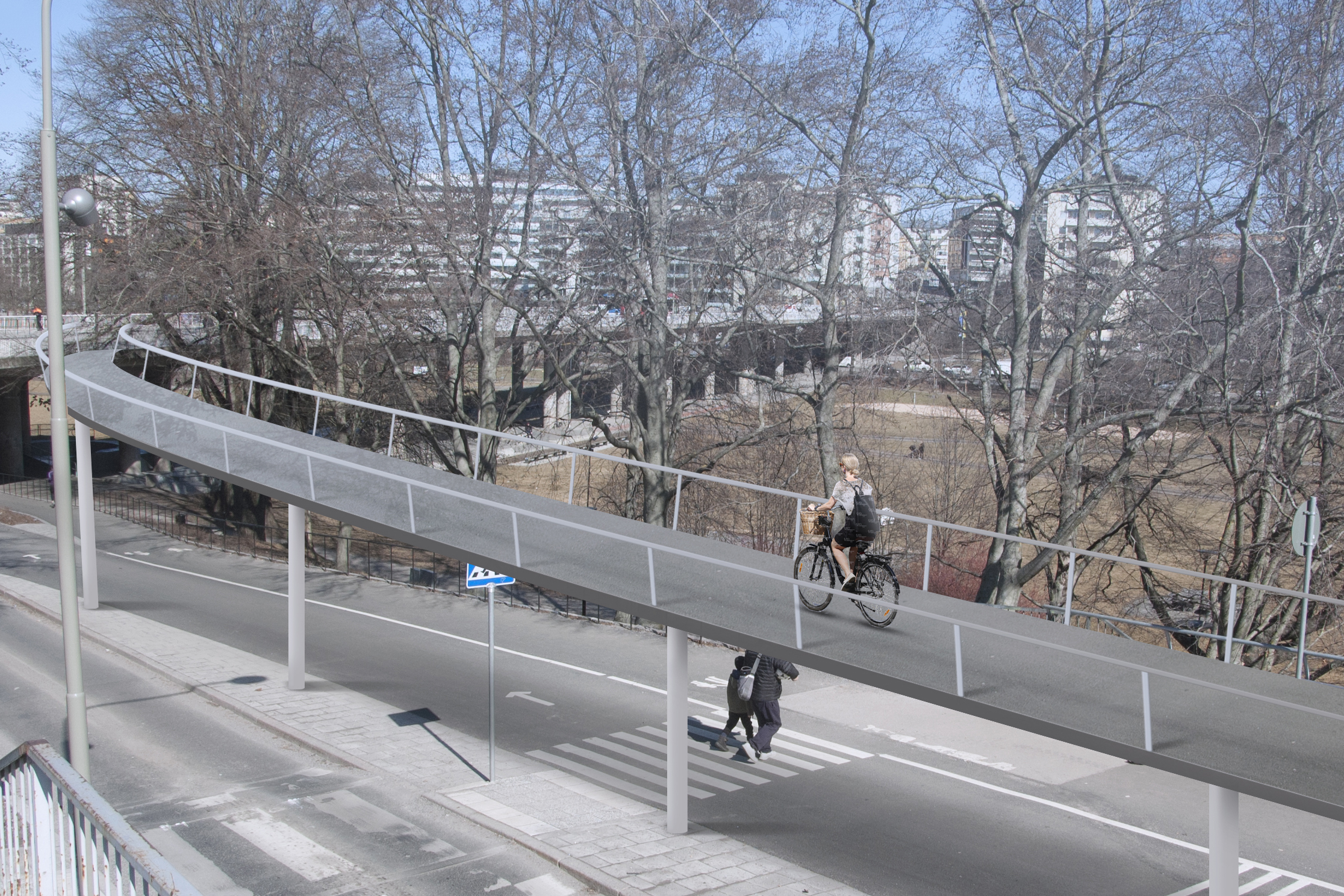 The first outcome was a concept to add an extra bridge at Västerbroplan to reduce dangerous interactions between bicyclists and pedestrians/cars.