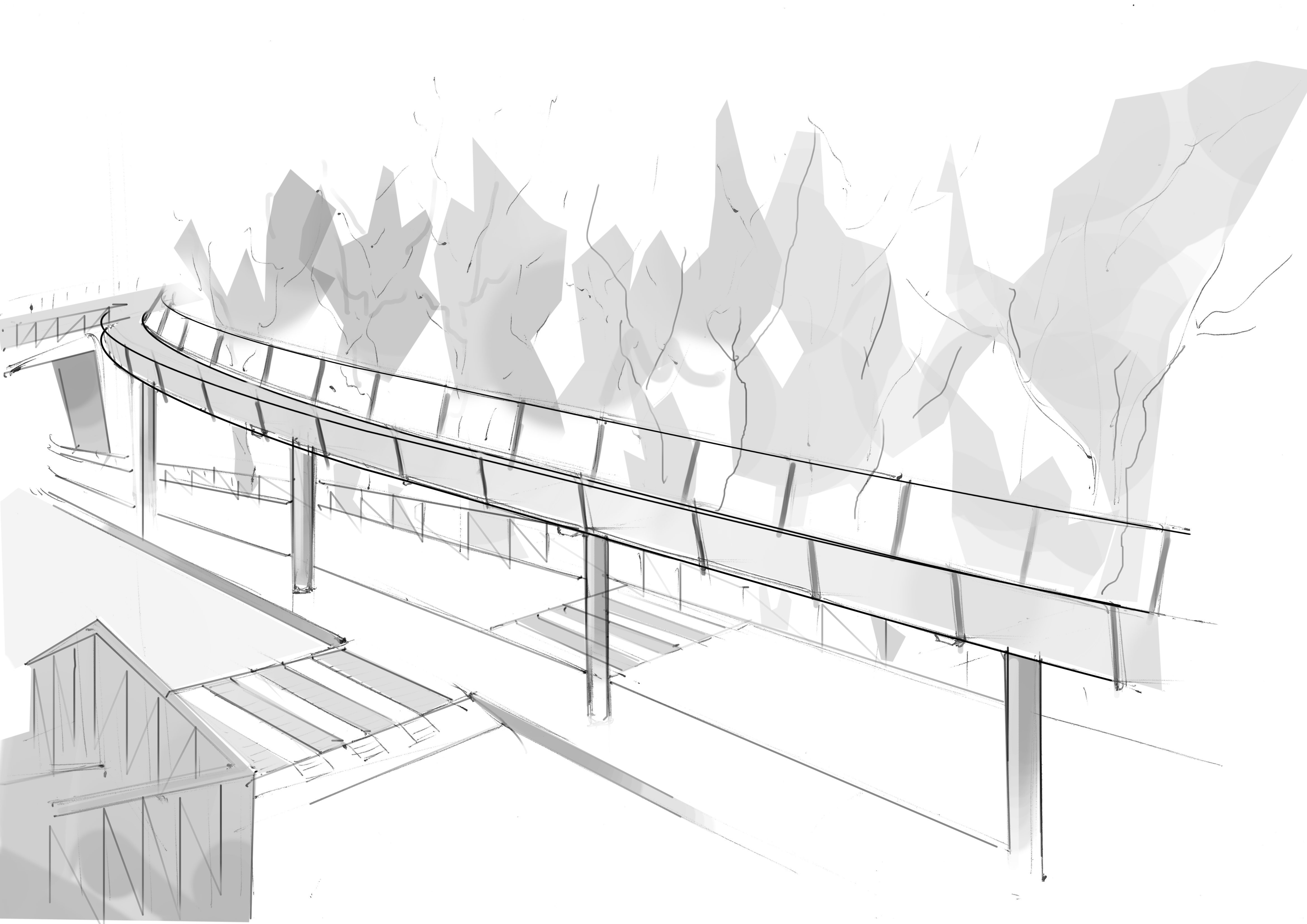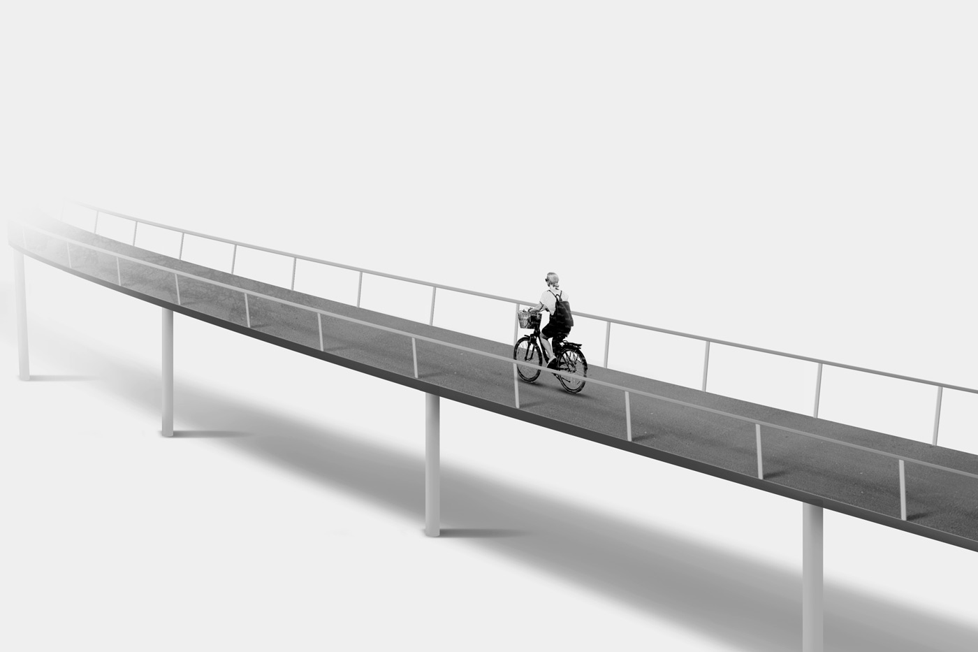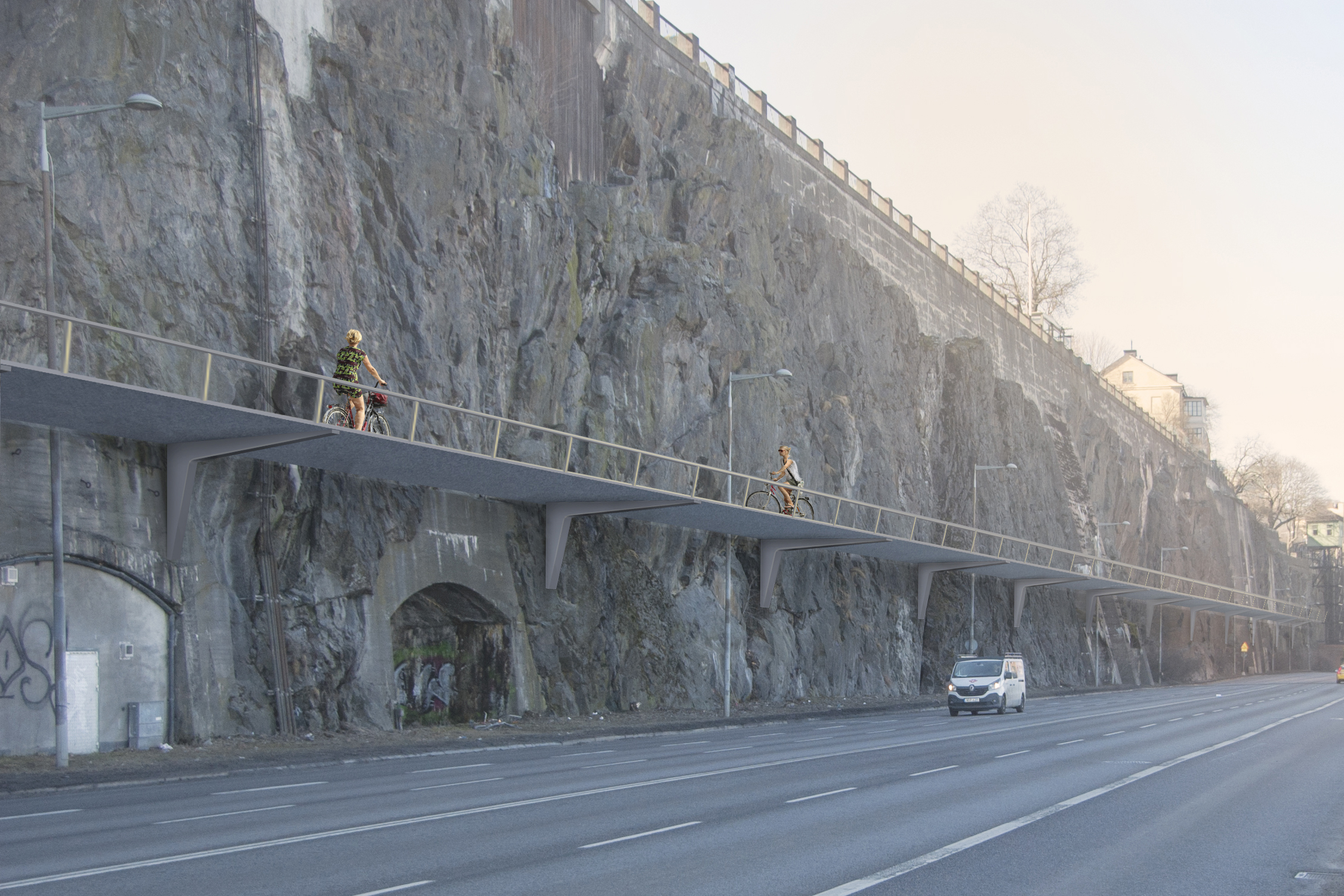 The second concept was to hang a bicycle bridge on the rockface at Stadsgården. This separates the bicyclists from the cars, as well as having the added benefit of creating a bicycle lane with a truly spectacualr view.