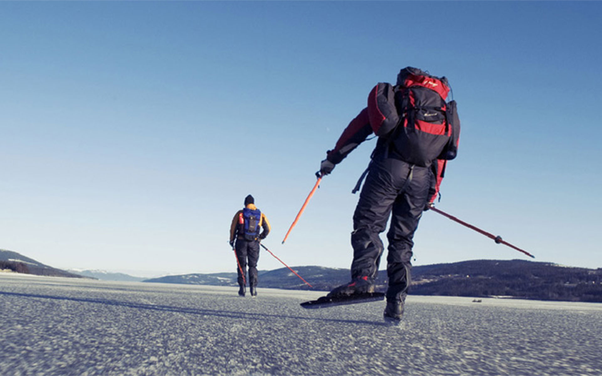 Lundhags is the leading company in Scandinavia that produces equipment for outdoor ice-skating. We designed this model with a flexible band – a built-in mounting device which keeps the two parts together when the skates are not in use. When ice-skating in the nature, it is common to have to get across frozen lakes, then it is great advantage and very practical to carry both skates together.
